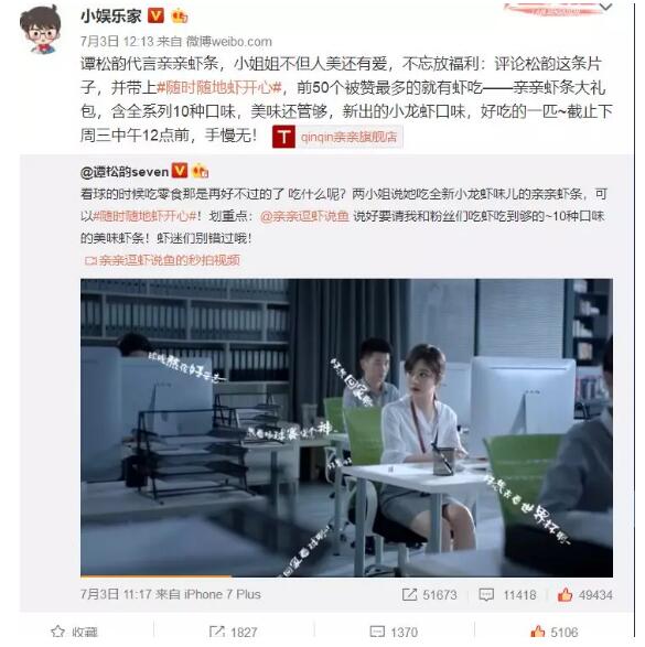 值得注意的是,在广告片上线的同时,亲亲虾条还通过自己的官方微博@亲亲逗虾说鱼 与广大消费者进行话题互动。只要评论谭松韵的微博并带上话题#随时随地虾开心# ,亲亲虾条就将为点赞多的前50位粉丝送出50份超级大礼包,全系列10口味都有,活动截止到7月11日中午12点前。