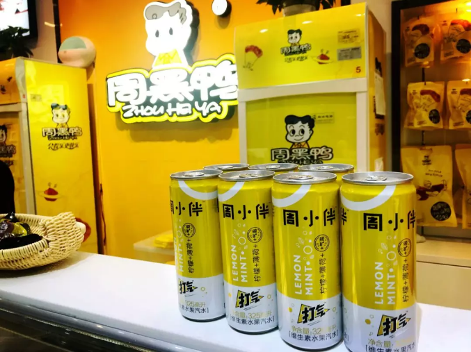 而且,两者的合作其实从世界杯开始就有苗头。世界杯期间,统一打气为周黑鸭定制罐装新品“周小伴”,是一款柠檬薄荷维生素果味汽水。含量为325毫升/罐,罐体主色调保留了原瓶装的明黄色,以“周小伴”和“打气”的双品牌logo出现。“周小伴”在周黑鸭门店以套餐形式进行销售。