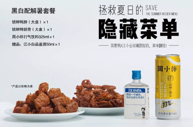 而“打气”和周黑鸭的这个“鸭脖”+“饮料”的看球套餐中,江小白也以“赠品”形式出现其中。
