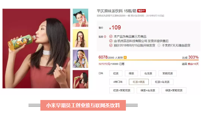 目前,该款茶饮料新品正处于众筹阶段,15瓶众筹价55元。截至今日,从网页界面来看,距离众筹结束还有10天,但已筹32.7272万元,达成率达303%,可见小米粉丝对于该款茶饮料相当看好。