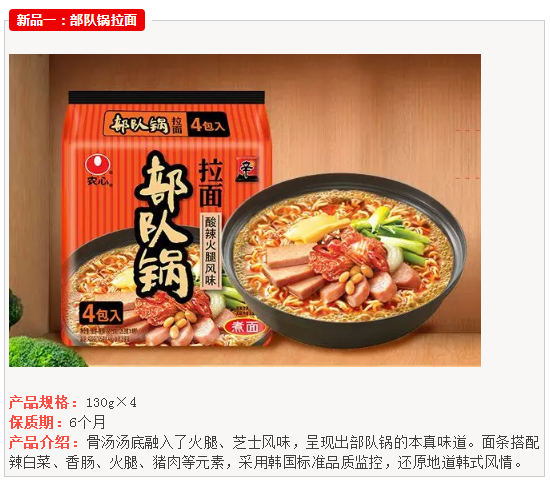 目前,这三款产品已经在农心的天猫旗舰店、京东旗舰店上架销售,其中,部队锅拉面、辣白菜拉面新品也在线下布局。