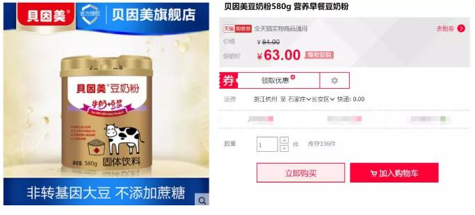 据了解,贝因美豆奶粉定位固体饮料,采用新西兰进口奶源+北大荒非转基因大豆的结合,其中奶粉添加量达23%,并用果糖替代蔗糖,主攻“营养早餐”市场,保质期为540天,目前售价为63元/罐,规格为580g,在天猫、京东、1号店等电商平台均有在售。