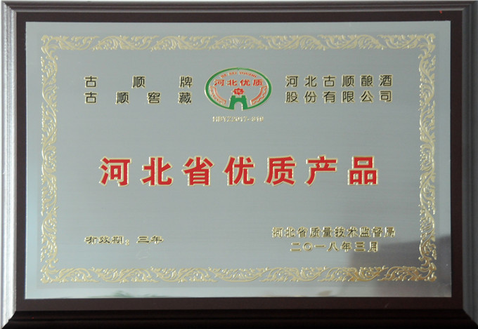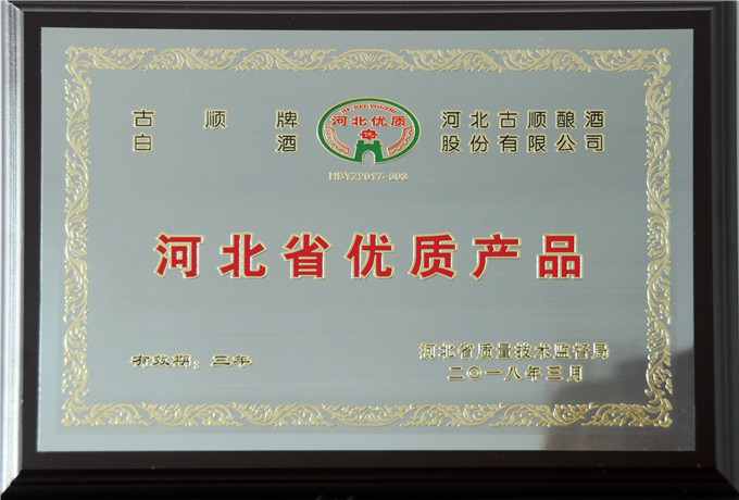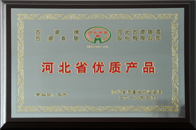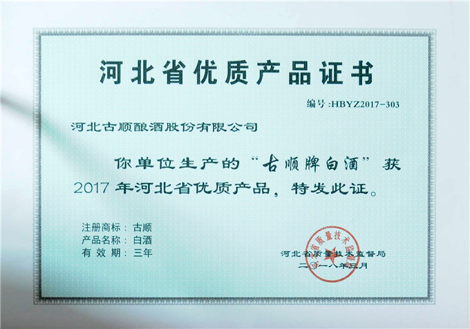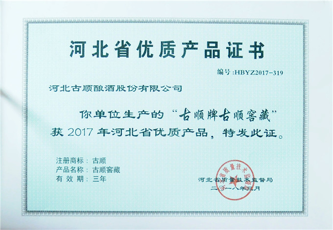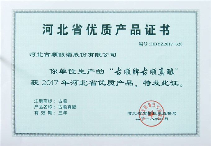 河北省质量技术监督局颁发的2017年河北省优质产品奖新鲜出炉啦!河北古顺酿酒股份有限公司生产的“古顺牌白酒”、“古顺牌古顺窖藏”、“古顺牌古顺真酿”获评“河北省优质产品”奖!
