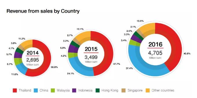 由图可知,小老板中国市场的收入占比一路攀升,从2014年的11.6%到2017年的40%,超过泰国本土销售收入,成为小老板一大市场。