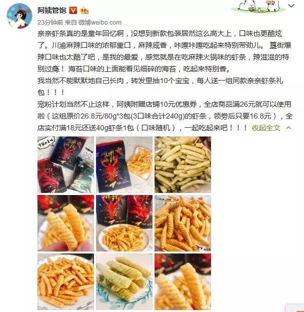 亲亲虾条“校园篇”广告大片的发布,在线上带动起更多话题传播。其中,两位微博大V阿姨管饱、深夜放毒少女也主动打Call,并给广大粉丝送出福利——亲亲虾条联合电商平台搞活动,9月19日-21日期间,只要满18元就送40g虾条一包,满26元减10元。而这恰恰也是亲亲虾条校园营销的重要环节。毕竟,通过电商平台购买休闲零食是年轻人生活不可或缺的一部分,对此亲亲虾条显然已经进行了精准的洞察。