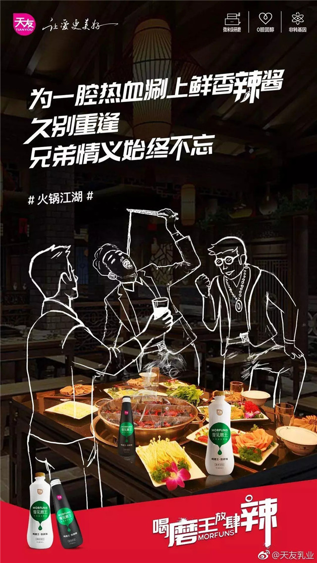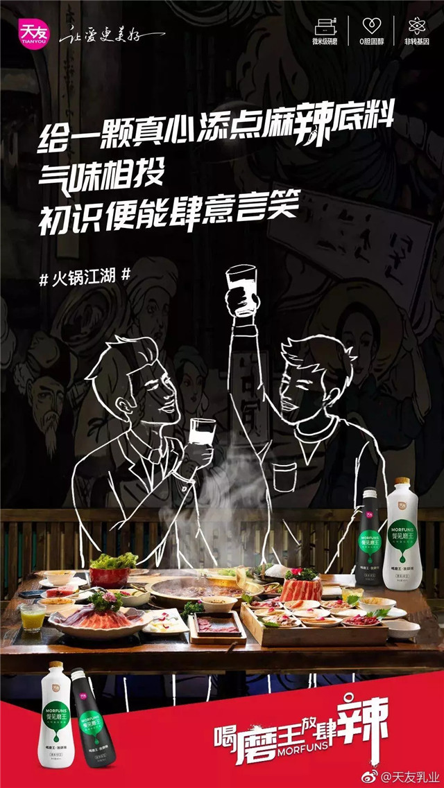 而餐见磨王植物蛋白饮品品牌以“喝磨王,放肆辣”为宣传口号,再一次展示天友倡导麻辣江湖中“让我们红汤作伴,辣的潇潇洒洒”的鲜明主张。天友餐见磨王,重庆品牌才更懂重庆味道。