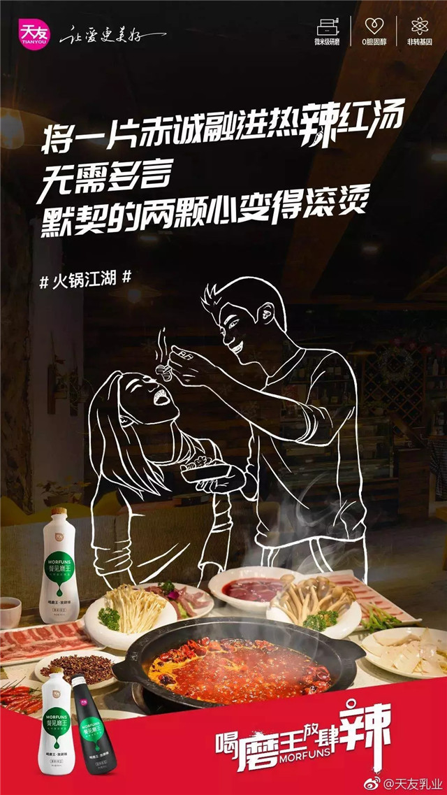 此外,11月26日,2018腾讯火锅狂欢节盛大启幕,以“了不起的重庆火锅”为主题,将在全重庆100家主流火锅店展开为期3个月的美食巡礼。为了将产品更快推向市场,天友乳业联手此次活动:腾讯火锅狂欢节期间,凡参与互动的网友,均有机会免费品尝天友全新推出的植物蛋白饮品——餐见磨王。