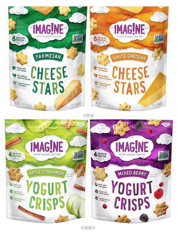 近日,百事食品饮料巨头百事公司旗下子公司Frito-Lay最近推出了一系列面向儿童的健康零食:Imagine品牌的酸奶薯片(Yogurt Crisps)和奶酪制成的零食“奶酪星”(Cheese Stars)。