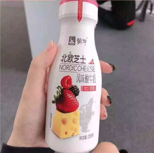 蒙牛推出了颜值颇高的北欧芝士风味酸奶。这款产品含有近两年大火的芝士元素,同时添加草莓、树莓等各种梅类,凸显了水果的清新风格。此外,采用PET瓶装,220g/瓶的规格使产品便于携带。