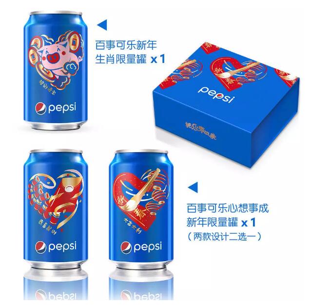 这几年,百事可乐对中国市场十分重视,为了讨好消费者,百事亦是抓住中国春节元素,推出生肖限量罐。今年,百事可乐除了邀请邓超、周冬雨、杨洋、刘昊然参演贺岁主题微电影《2019把乐带回家——摘星者》之外,又玩起了“罐罐营销”,推出猪年限量罐。