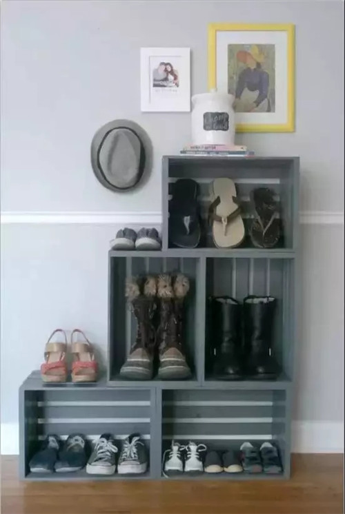 如果你家里的走廊足够宽阔,或者有步入式衣帽间,那么,用葡萄酒木箱存放鞋子效果会非常好。你可以根据鞋子的款式,将高筒靴放入垂直的木箱,将平底鞋放入水平的木箱。