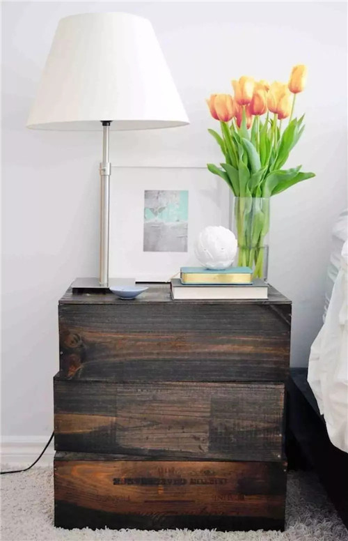 用 3-4 个木箱,堆叠出一个与床同高或者比床矮一点的床头柜,还可以根据自己的偏好,给床头柜设计喜欢的图案。