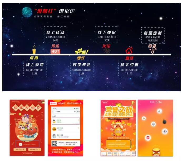 “百星计划”在寒假期间便在学生群体中开始好运符、荣耀之战、校园集结、公告号抽奖等预热环节,在3月10日-20日开学季形成爆炸,4月和5月进行线下强化和引爆,最终产品形成校园中的明星产品。通过一个学期的时间闭环,打造校园网红。