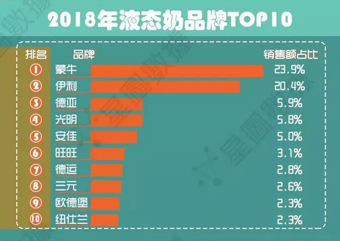 由图表二2018年液态奶品牌TOP10榜单我们可以了解到,蒙牛和伊利依然是液奶行业的两大寡头,销售份额分别为23.9%和20.4%,占据了近一半的市场份额,远远甩开占据第二阵营的德亚、光明以及安佳。