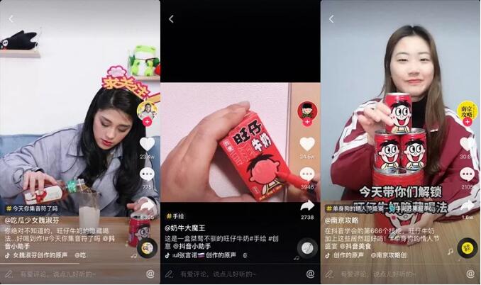 近年来,旺旺频频跨界,卖国潮服饰、卖日化,“搞大了”系列营销,都为其搏来诸多关注;微博话题“XX颗旺仔牛奶糖融化,就变成旺仔牛奶了?”更是长期占据热搜;抖音平台上“旺仔牛奶的隐藏喝法、手绘旺仔牛奶新包装”等短视频更是引爆全网,点赞数高达30万+的短视频不计其数,引来诸多效仿的同时,更是在无形中为品牌进行宣传带货。