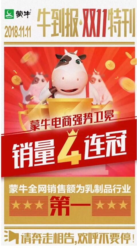 或许蒙牛称霸线上平台早有预兆,在2018年京东618年中购物节期间,蒙牛常温乳品以超过1亿的销售额夺得液态奶品类同时食品饮料品类的采销和POP渠道双冠军;蒙牛京东低温乳品销量位列低温乳品销售榜单第1名,累计销量破千万。同年的双十一大战中,蒙牛更是全网销售额较去年提前7小时破亿。