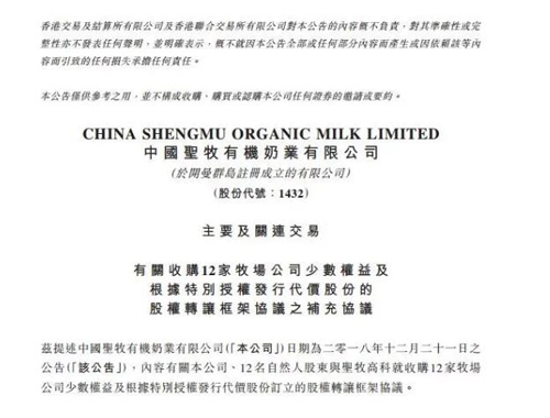 中国圣牧发布的公告显示,收购内容有关公司、12 名自然人股东与圣牧高科就收购 12 家牧场公司少数权益及根据特别授权发行代价股份订立股权转让框架协议。根据股权转让框架协议,圣牧高科将于股权转让框架协议的所有先决条件全部成就后至 2019 年 11 月 30 日前分期向 12 名自然人股东支付全部现金对价。如股权转让框架协议的所有先决条件于 2019 年 2 月 28 日前得以全部满足,圣牧高科将自 2019 年 3 月起支付现金对价。