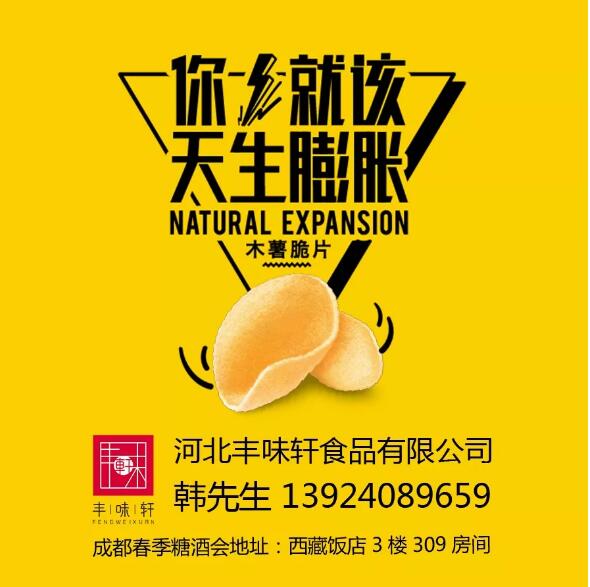 这次成都春糖,丰味轩已是有备而来,更将竭尽所能向广大经销商展示企业实力以及优质的产品。2019年“天生膨胀”木薯脆片必将成为薯片市场上一道靓丽的风景线。成功,就在眼前;商机,不容错过!