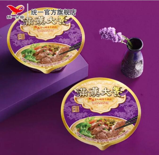 此外,食品板了解到,除了相拌一城的“麻酱凉皮”,统一旗下高端生活面的另一品牌代表——满汉大餐也陆续开发了新品:“御品老坛酸菜牛肉面”和“川式销魂麻辣牛肉面”,两款产品尝鲜价18.8一碗,现已于京东上市。