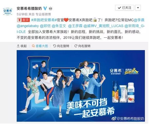 近年来,安慕希的狂飙突进尤其是突破百亿大关的惊人表现,给整个乳制品行业带来冲击波。进入2019年,安慕希延续了去年的强势表现,可谓动作不断。食品板获悉,继年初推出高端畅饮型橙肉凤梨新品之后,安慕希在品牌营销方面也放出大招。近日,在新一季《奔跑吧》开跑前,安慕希将节目的全部明星团员招致麾下,再次成为人们关注和讨论的焦点。