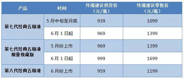 1.从通知之日起,第七代经典五粮液终端供货价调整为939元/瓶,终端建议零售价为1099元/瓶;从6月1日起供货价调整为969元/瓶,终端建议零售价为1399元/瓶;