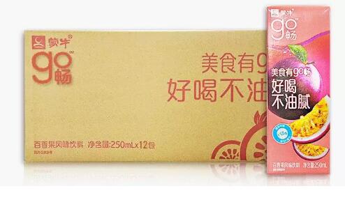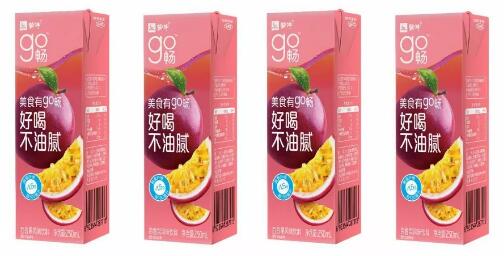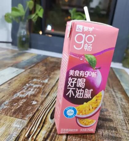 近日,蒙牛推出了一款go畅百香果风味饮料,这款产品净含量为250ml,每100ml中含有超过1.5g的膳食纤维,浓缩百香果汁的添加量大于等于500mg/100ml,以“美食有go畅,好喝不油腻”为主打口号。