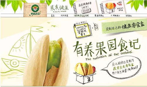在品牌页,我们没有用严肃的“品牌故事”之类的标题,而是用了具有随意感、亲切感的“关于老农的那些事儿”,整体色调仍旧以草绿为底,与产品包装主色调相呼应,并以纯线条勾画各种形态饱满的干果,干果花纹与外包装纸箱图案形成呼应。