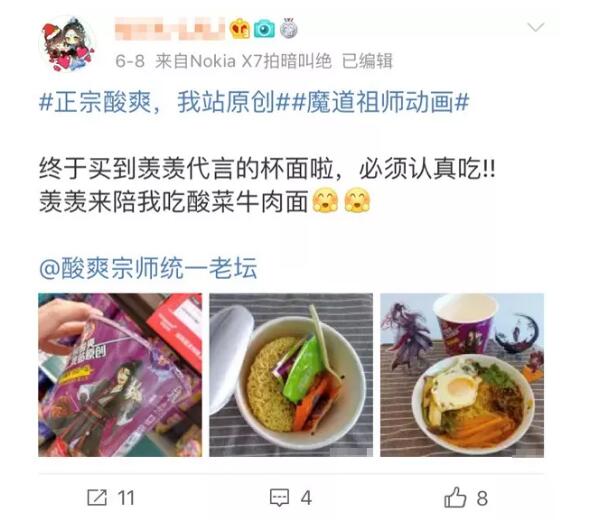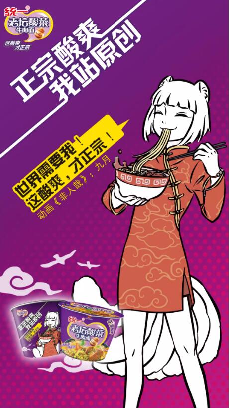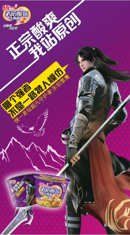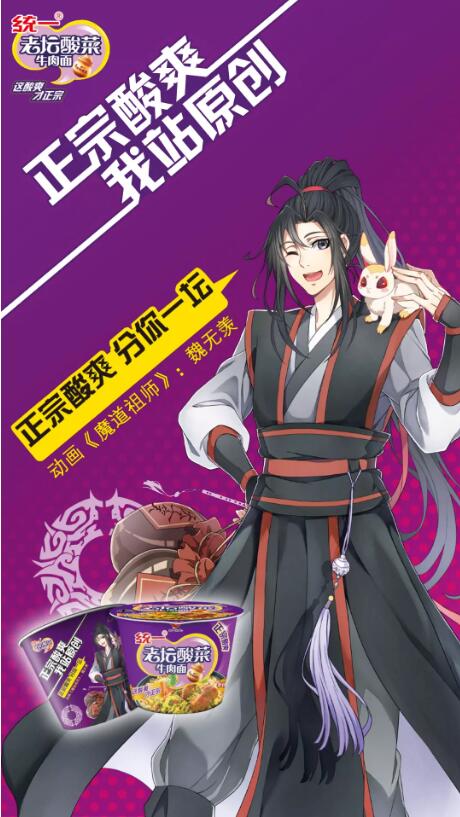今年,统一老坛联合三部国产动漫——《魔道祖师》、《非人哉》和《雪鹰领主》,推出了统一老坛酸菜牛肉面国漫合作款新包装,引发了喜欢二次元的年轻消费群体热烈响应。