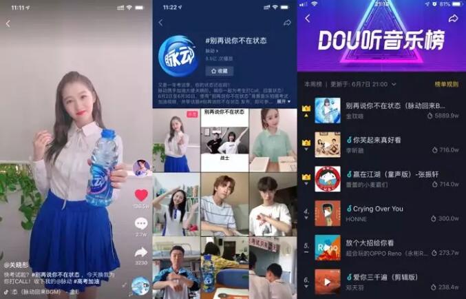 “从公开数据我们看到,网络上脉动高考互助话题的阅读量已超过2亿次,除了高考生,还有不少中考生、四六级大学考生、护考生等近百万名我们的目标消费人群自发参与进来。6月7日高考当天,脉动基于年轻人生活洞察打造出来的品牌歌《别再说你不在状态》牢牢占据抖音音乐榜翘楚地位,截至目前有近7万人使用该音乐拍摄视频,视频的总播放量接近9亿次。”脉动品牌方表示。据了解,考试季作为今年饮料旺季开启后的一个重要营销节点,从5月底开始,脉动已重磅投入数千万元。