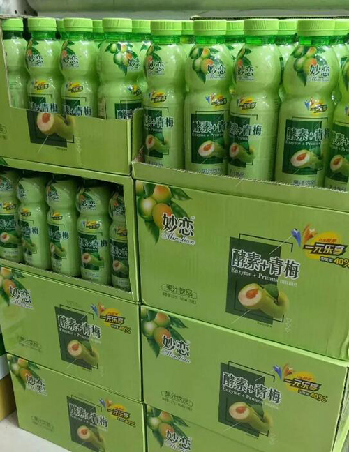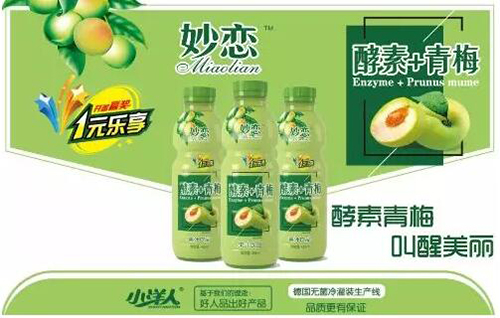 2019年6月,小洋人旗下的“妙恋”品牌便推出了一款“酵素+青梅”果汁饮品,为400ml规格,市场售价约为4元/瓶。