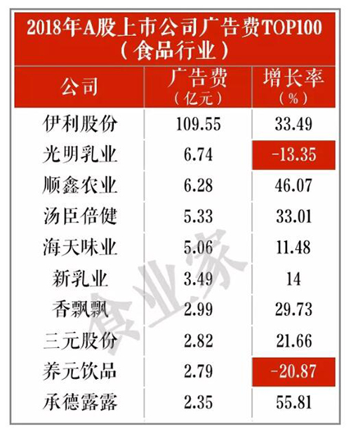 再看2018年A股上市公司广告费百强排行榜,上榜的多家食品制造企业除光明乳业和养元饮品外,在2018年广告费均呈现增长趋势,且增长率不少于10%。