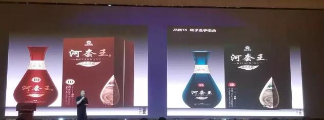 在发布会现场,共有两款新品上市,一款是 52°典藏尊享河套王,终端定价为1180元,另一款为河套王喜宴用酒,名为“喜臻”,定价300元+。