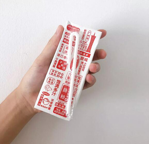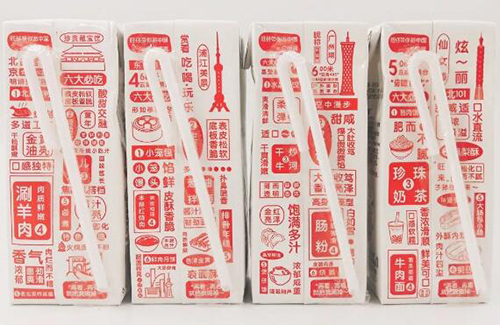 奶味十足的包装背面都有不一样的图案,全国的不同区域,都被不同的美食所包围:新疆的烤羊肉串、云南的过桥米线青海的青稞和甜醅、四川的火锅、山西的刀削面、山东的烙饼……