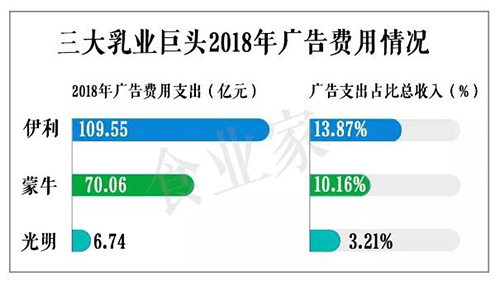 上市公司广告营销费用TOP榜单上,伊利和蒙牛常年跻身前20名。2018年,伊利广告投入109.55亿,约占总营收的13.87%;蒙牛广告投入70.06亿,约占总营收的10.16%。