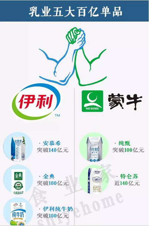 在单品上,伊利安慕希销售突破140亿,金典、伊利纯牛奶均突破100亿;蒙牛特仑苏销售近140亿,纯甄也突破100亿。当今中国快消的百亿单品,乳品占据半壁江山。