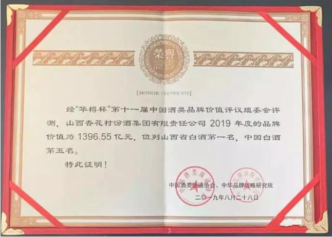 8月28日,中国 酒类流通协会和中华品牌战略研究院在北京国家会议中心联合发布2019年《第11届“华樽杯”中国 酒类品牌价值200强研究报告》。汾酒集团以 1396.55亿元的品牌价值位列中国白酒第五名,山西省白酒第一名。