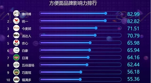 报告数据显示,在饮料领域,康师傅力压可口可乐、农夫山泉、王老吉这些强势品牌,一跃位居行业翘楚,统一、可口、农夫、百事分列二到五位。
