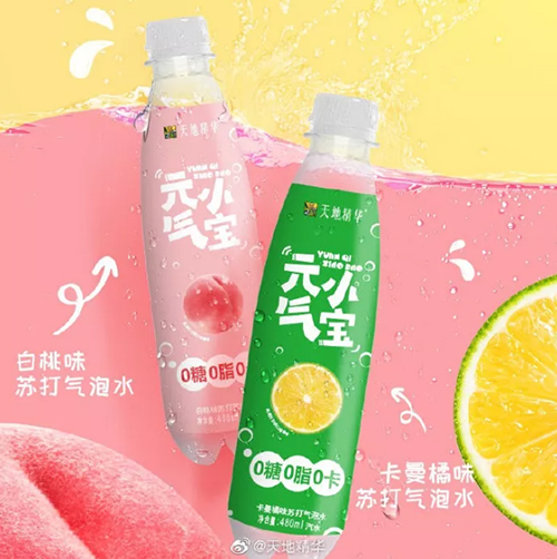 “元气小宝”苏打气泡水定位为“0糖0脂0卡”的健康饮品,采用代糖“赤藓糖醇”取代白砂糖,产品的规格为480ml/瓶,有白桃和卡曼橘两种口味。线上渠道在天猫、京东以及天地精华官方微店均有开售,15瓶/箱的售价在59.9-63.9元之间,约合4元/瓶;线下终端的建议零售价为75元/箱,建议零售价为5元/瓶。