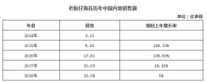 2014年,已经入华两年的老板仔海苔内地销售额3.13亿泰铢,约合人民币6300万元,随后迎来三级跳,2015年~2017年分别收入1.67亿元、3.52亿元、4.21亿元,营收占比从2014年的11.6%到2017年的40%,甚至超过泰国本土销售收入,但2018年老板仔在内地的销售额明显趋缓,仅仅微增5%,2019年上半年老板仔已经遭遇了8.8%的同比下滑。在经历爆发式增长后,老板仔海苔需要探索新周期的发展模式。