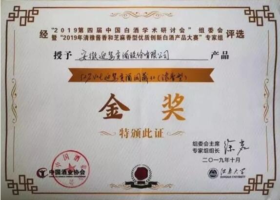 迎驾获得了52度迎驾洞藏30浓香型金奖