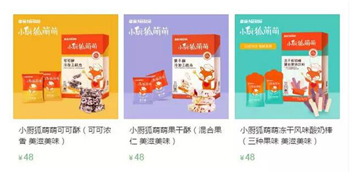 小厨狐萌萌品牌产品目前有3款SKU,果干酥、可可酥、动感风味酸奶棒,包装规格为112克,内含独立小包装,售价均为48元/盒。
