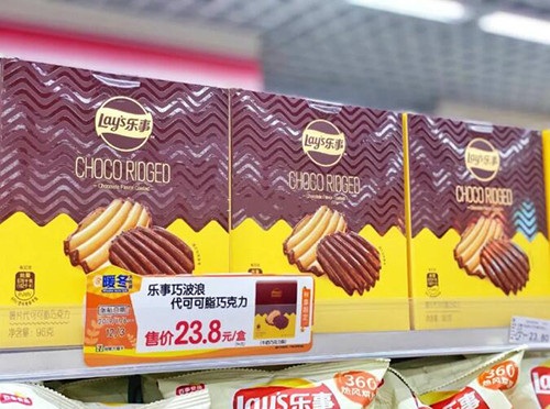 除了这款产品之外,乐事也推出了另一款新品——“巧波浪代可可脂巧克力”,在经典的大波浪薯片的基础上,添加一层巧克力涂层,咸甜口味搭配薯片本身的香脆,带来独特的口感。目前,这款产品已经在各大终端上架销售,售价为23.8元/盒。