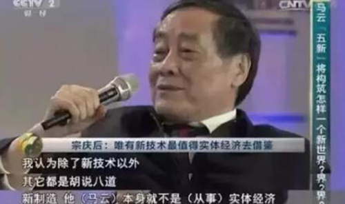 此前,宗庆后对于马云提出的“新零售”也看不太上,在央视《对话》节目中,宗庆后说:“除了新技术,其他都是胡说八道。(马云)本身不是(从事)实体经济的,(能)制造什么东西?”
