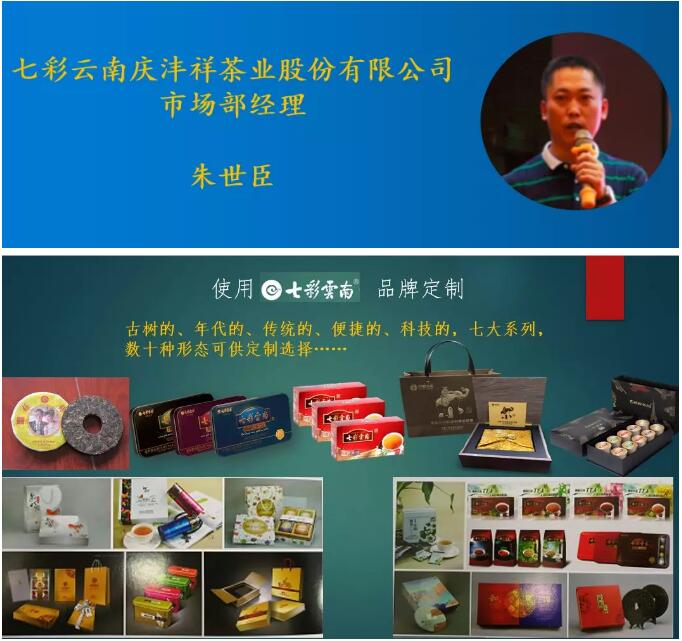 七彩云南庆沣祥茶业股份有限公司市场部经理朱世臣则分享了七彩云南的优势以及产品定制的方式。七彩云南具有品牌、产品、质量、产品研发、服务等多方面优势,能为客户提供多种灵活的定制方式。