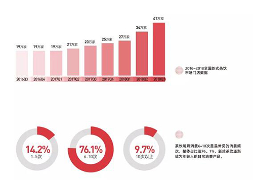 据介绍,门店现制奶茶是当下奶茶市场的核心品类,尤其新式茶饮的概念走红之后一发不可收,截至2018年第三季度全国门店超过41万家,喜欢追求新潮和个性的年轻群体成为消费主力军,6~10次/月成为常见的消费频次。