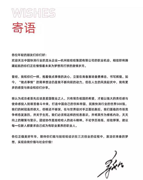 查询得知,该项目由广州娃哈哈健康饮品有限公司操盘。该公司成立于2019年10月,娃哈哈商业股份有限公司为其法人股东之一,而后者的法人以及董事长正是宗庆后,由此也可基本断定该项目的真实性,娃哈哈进军线下奶茶店是在玩真的了。《合作手册》中也附录了署名宗庆后的寄语,称这是娃哈哈的第三次创业,希望每一位合作伙伴都能“实现自我价值与社会价值”。