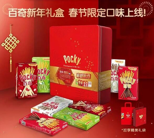 针对春节新品,格力高百奇推出红罐新年礼盒产品,配以定制款精美铁盒,和萌狮环保袋,同时搭配限定款荔枝口味新品和抹茶味、牛奶味、巧克力味等多款产品,带给消费者浓浓的节日气氛。