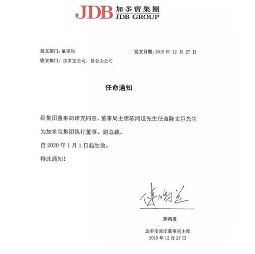 昨日,加多宝发布了一条任命通知:经董事局研究同意,主席陈鸿道任命陈文巨为加多宝集团执行董事、副总裁,自2020年1月1日起生效。