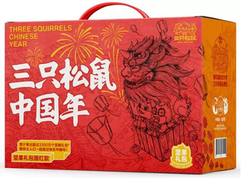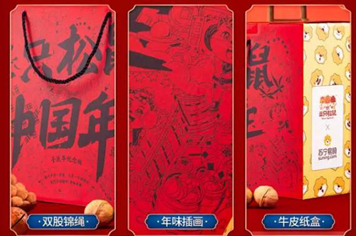 三只松鼠年礼研发人员表示,庚子年为鼠年,与品牌IP具有关联性,因此在每一款年礼设计元素里都会加入松鼠元素,继续采用“三只松鼠 中国年”的主题礼盒作为今年主打年货款。为突出包装盒的独特性,创造性地将蕴含春节元素的年兽、扫尘、团年饭、守岁、压岁钱、拜年、舞龙舞狮、拜神祭祖、放烟花等融入到包装插画中。三只松鼠年礼分为普通款、高端款等多种款式,价格也从40元到100多元不等,给了消费者充分的选择空间,满足不同阶层消费者需求。