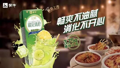 近日,蒙牛GO畅推出了一款“橘见青柠”新品,这是一款柠檬卡曼橘风味饮料,为250ml利乐包装,每包含有3.75g膳食纤维,口感清爽不油腻,可有助于消化。